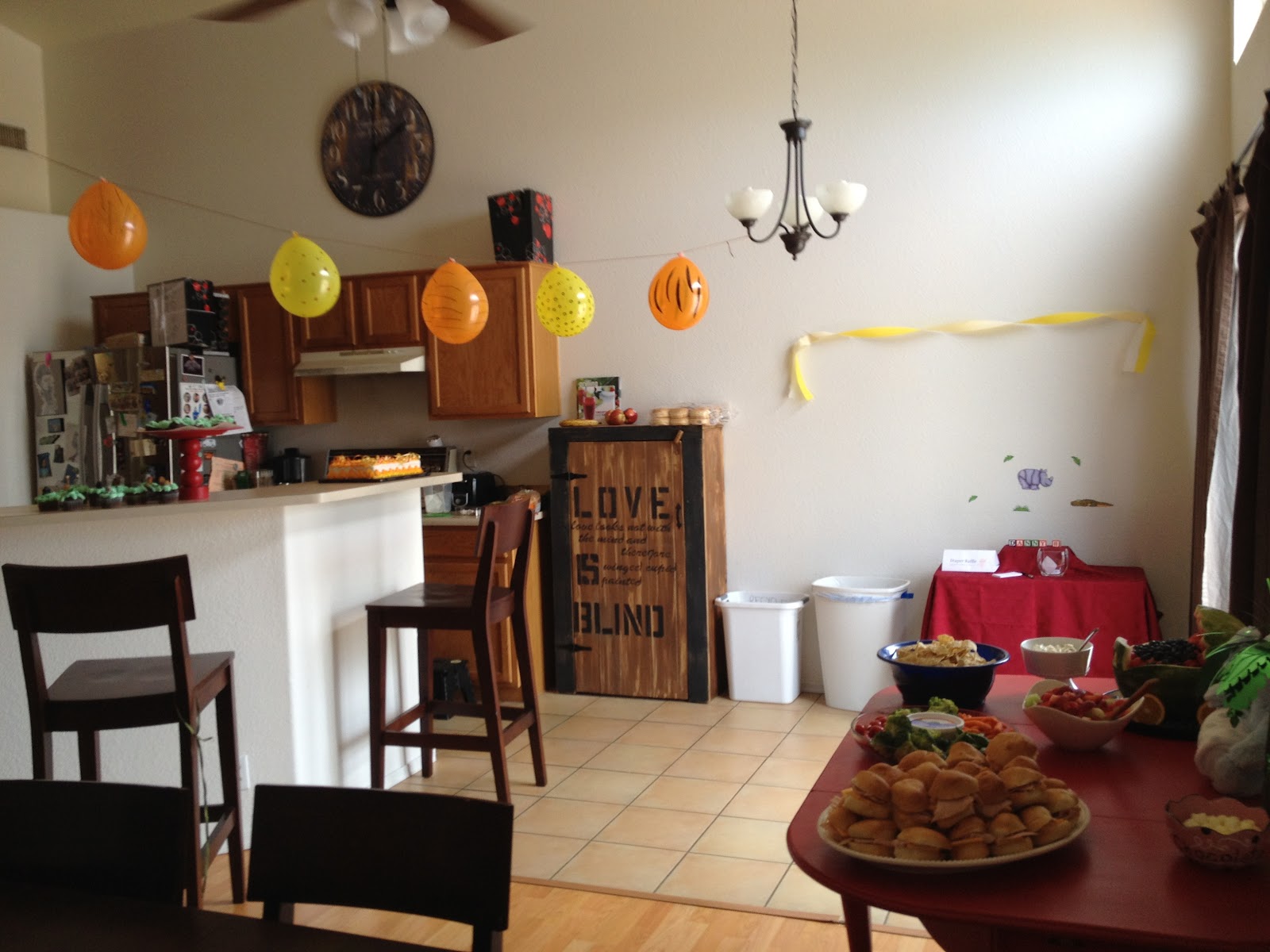 My beautiful painted table with the awesome spread. It was a jungle theme, can you tell? Those ham and cheese rolls were a big hit.
